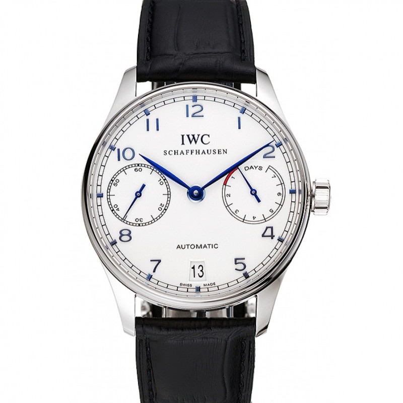 Haute qualité Blanc IWC Portugaise suisse Cadran Bleu Argent Numerals Caisse noire Bracelet en cuir 1453913