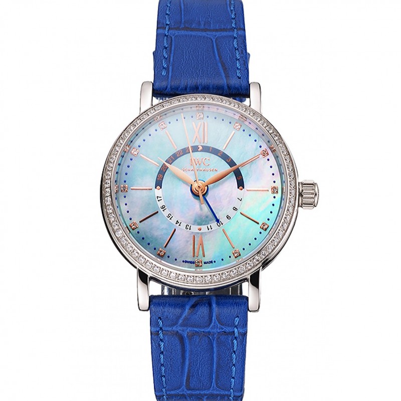 Luxe Replique Montre IWC Portofino Jour et Nuit Perle Cadran Boîtier en acier inoxydable Bracelet en cuir bleu
