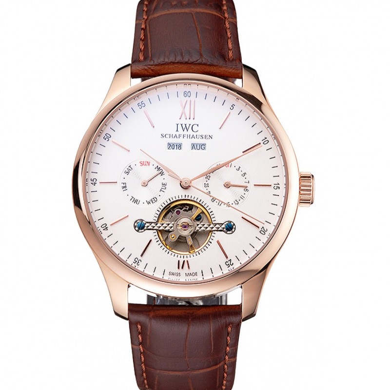IWC Portofino Tourbillon Cadran Blanc boîtier en or rose Broen bracelet en cuir