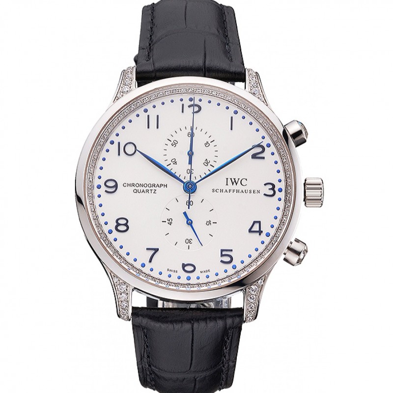 IWC Portugieser Chronographe Cadran blanc bleu mains et les cas Numerals acier avec diamants Bracelet en cuir noir