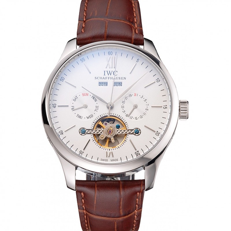 IWC Portofino Tourbillon Cadran Blanc Boîtier en acier inoxydable bracelet en cuir brun
