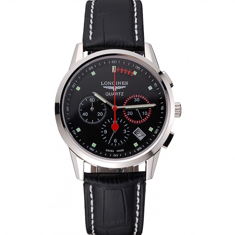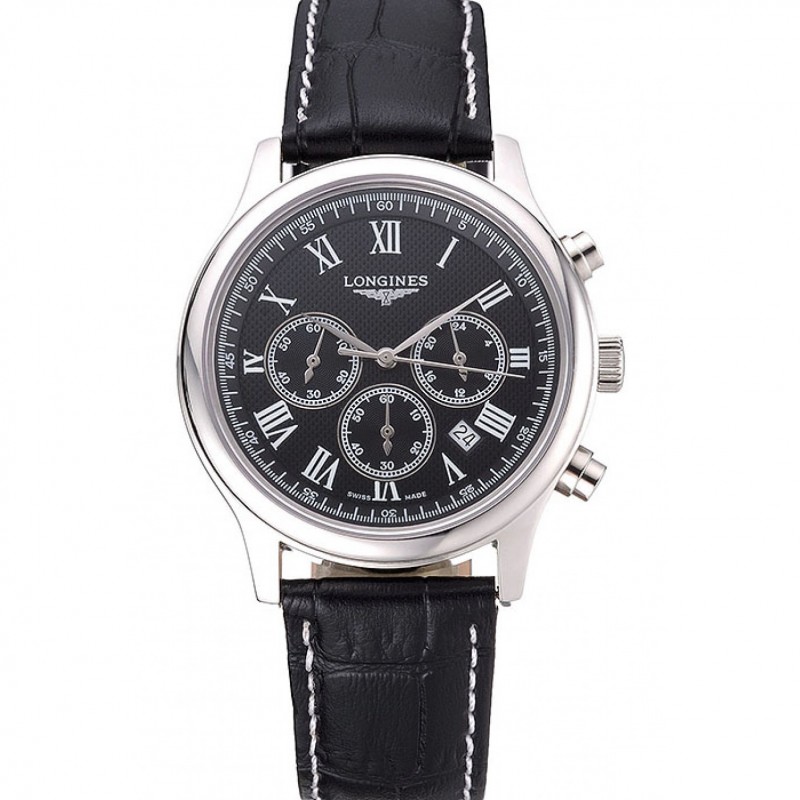 Longines Column Roue Cadran Noir Argent Boîtier en acier inoxydable Bracelet en cuir noir