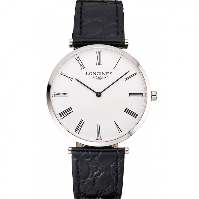SS Suisse Longines Grande Classique Cadran Blanc Cas romain en acier inoxydable Numerals bracelet en cuir noir
