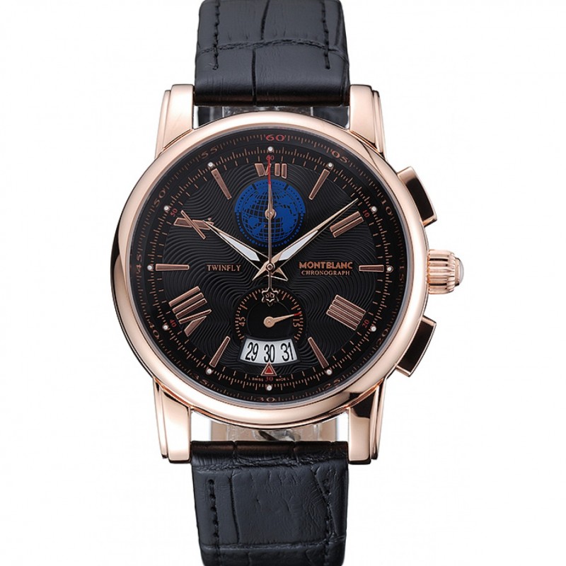 Luxe Replique Montre Montblanc Twinfly Chronographe Cadran Noir Bracelet en cuir noir 1454118