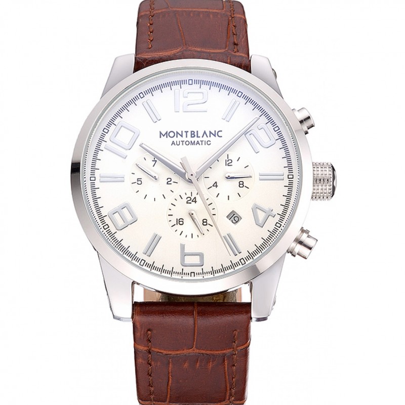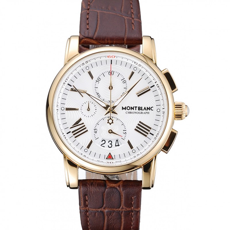 Montblanc Chronographe Cadran Blanc Bracelet en cuir brun boîtier en or 1454113