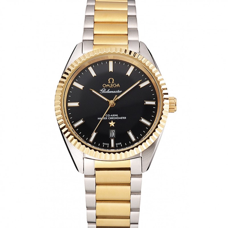 Meilleur Replique Montre Omega Globemaster cadran noir lunette en or Boîtier en acier inoxydable Bracelet Deux Tone