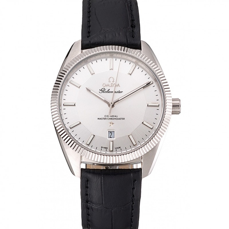Omega Globemaster cadran argenté Boîtier en acier inoxydable Bracelet en cuir noir