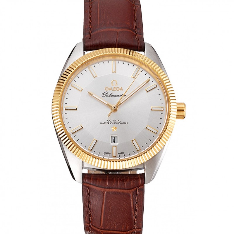 Meilleur Omega Globemaster Cadran Argent Or Lunette Boîtier en acier inoxydable bracelet en cuir brun