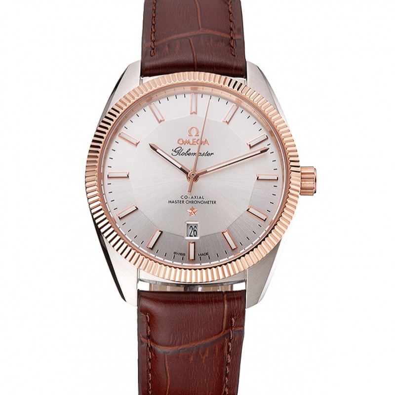 Omega Globemaster cadran argenté en or rose Bezel Boîtier en acier inoxydable bracelet en cuir brun