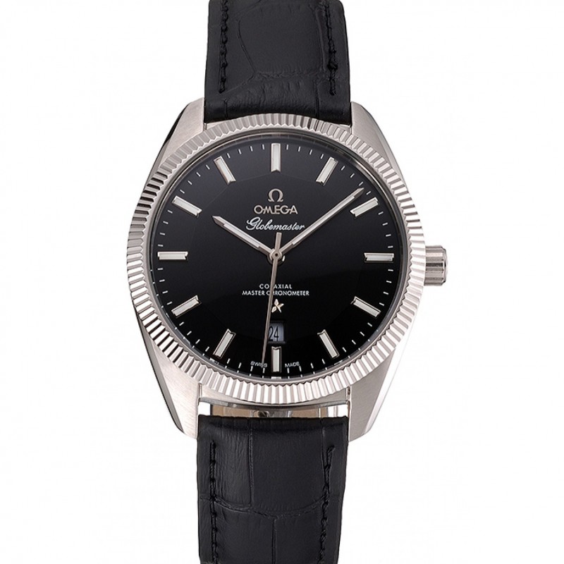 Omega Globemaster cadran noir Boîtier en acier inoxydable Bracelet en cuir noir