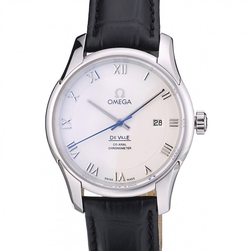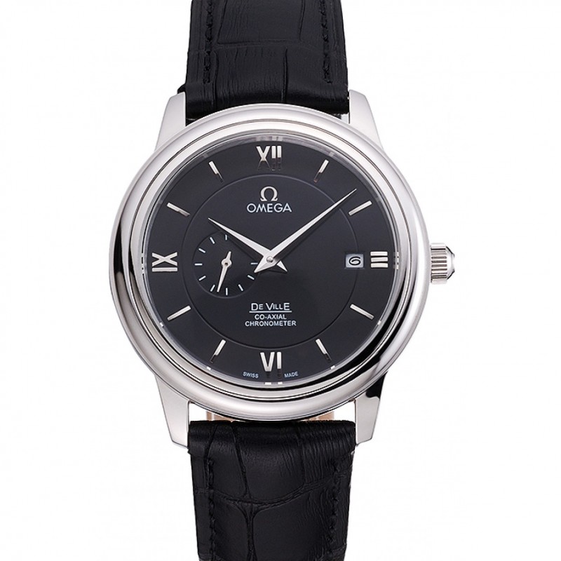 Omega De Ville Prestige Co-Axial Cadran Noir Argent Boîtier bracelet en cuir noir romaine numéral