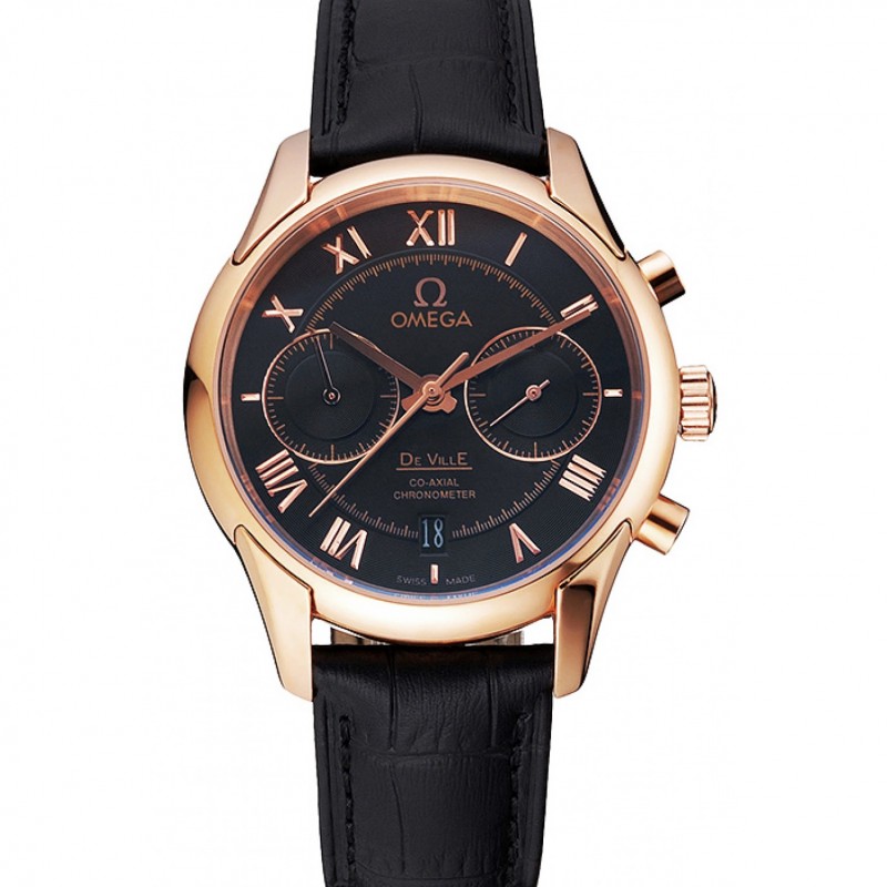 Omega DeVille lunette en or rose avec cadran noir et bracelet en cuir noir 621569