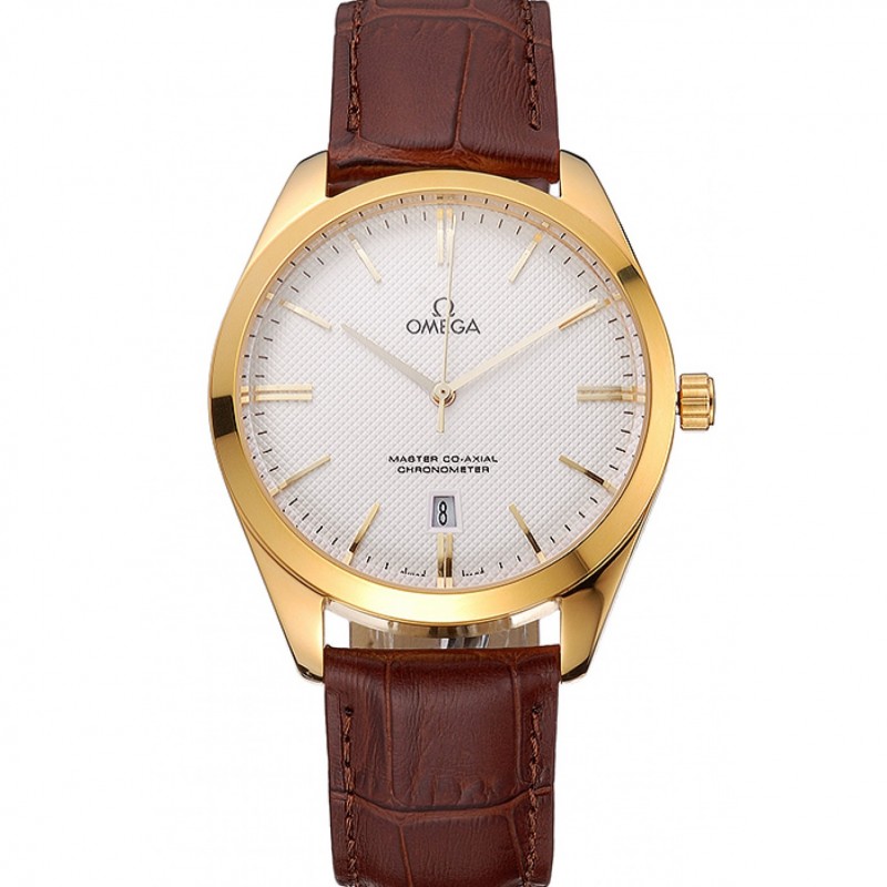 Haut Gamme Replique Montre Omega Tresor Maître Co-Axial Cadran Blanc boîtier en or bracelet en cuir brun