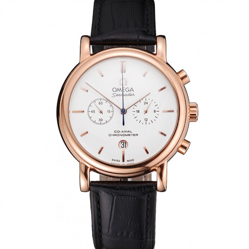 Omega Seamaster Vintage Chronograph Cadran Blanc boîtier en or rose Bracelet en cuir noir