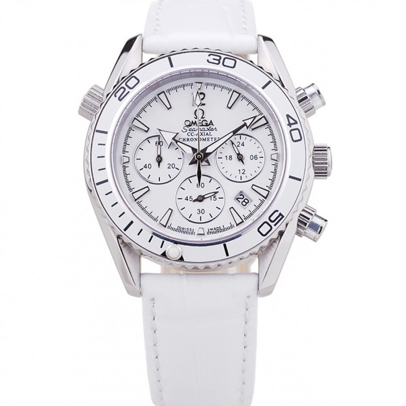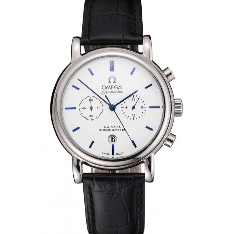 SS Omega Seamaster Vintage Chronograph Cadran Blanc Bleu heure marques Boîtier en acier inoxydable Bracelet en cuir noir