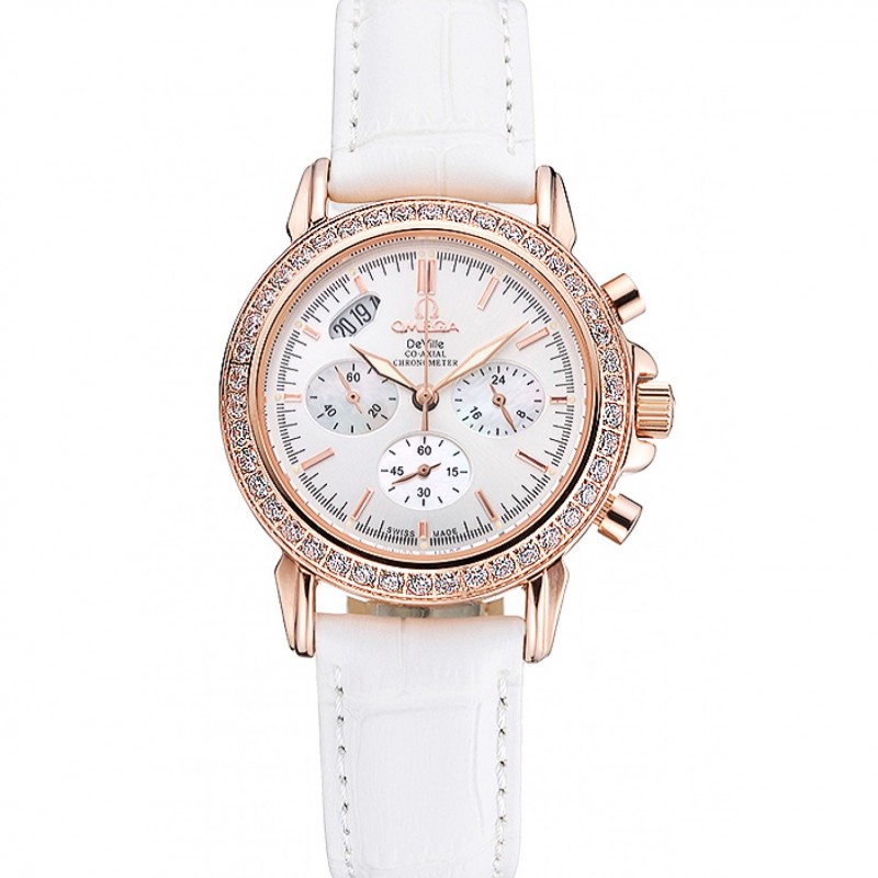 Haute qualité Replique Montre Omega Speedmaster Chronographe cadran blanc diamant en or blanc Bracelet en cuir de cas 622455