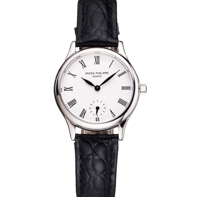 Patek Philippe Calatrava Cadran Blanc Cas romain en acier inoxydable Numerals bracelet en cuir noir