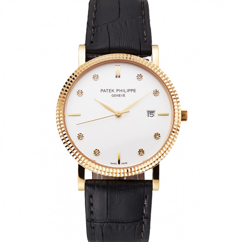 Patek Philippe Calatrava cadran blanc diamant heure marques nervuré Bezel boîtier en or Bracelet en cuir noir