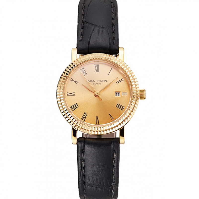 Patek Philippe Calatrava or cadran double nervuré Numerals Bezel boîtier en or Bracelet en cuir noir