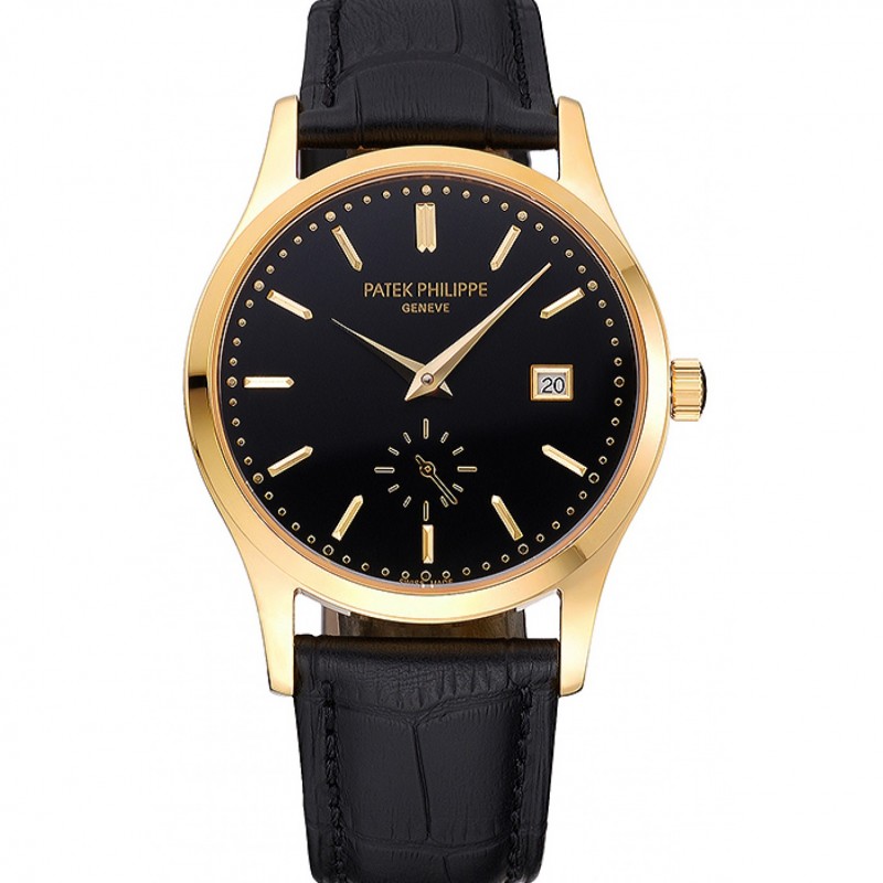 Haute qualité Replique Montre Patek Philippe Calatrava cadran noir boîtier en or bracelet en cuir noir 622845