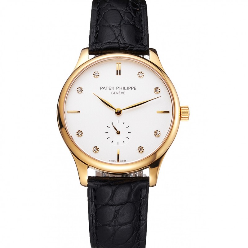 Patek Philippe Calatrava cadran blanc diamant Marquages boîtier en or Bracelet en cuir noir