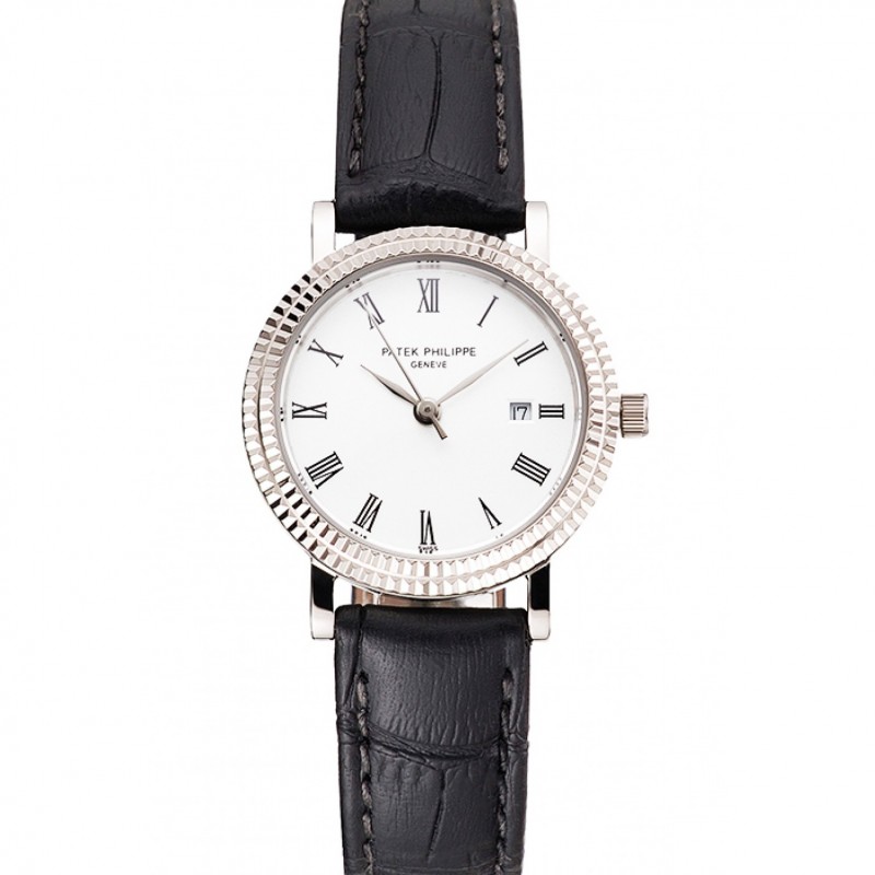 Patek Philippe Calatrava blanc cadran double nervuré Numerals Bezel Boîtier en acier inoxydable Bracelet en cuir noir
