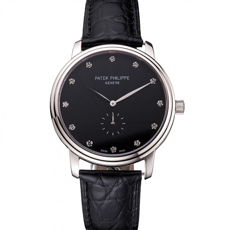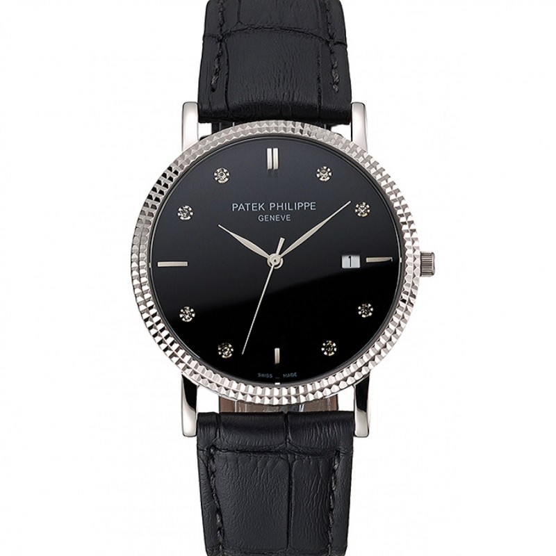Pas Cher Replique Montre Patek Philippe Calatrava cadran noir diamant heure marques Double nervuré Bezel Boîtier en acier inoxydable Bracelet en cuir noir