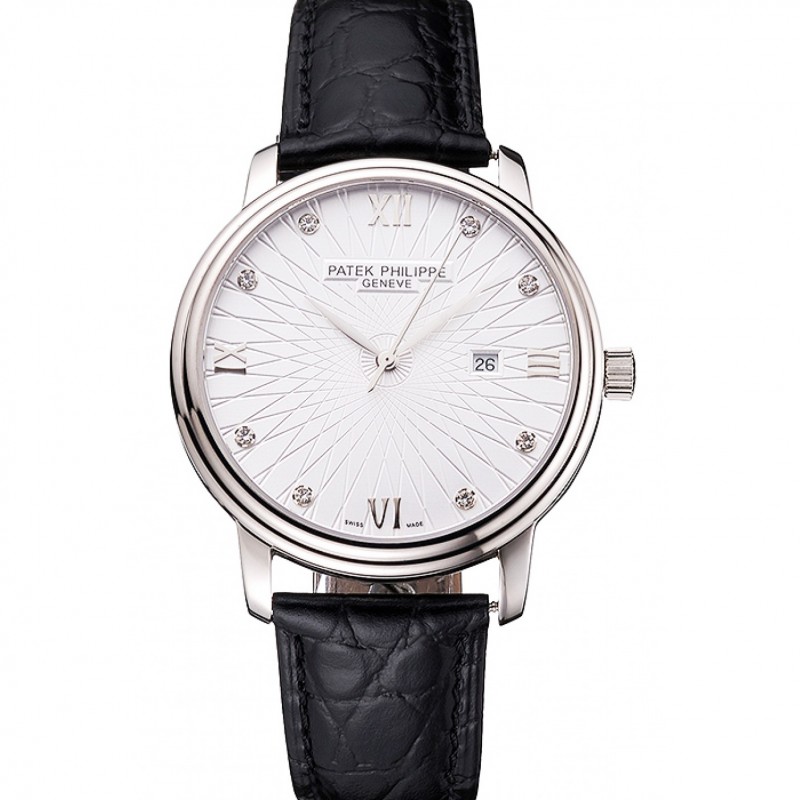 Luxe Patek Philippe Calatrava blanc Date gaufrée Cadran Boîtier en acier inoxydable Bracelet en cuir noir