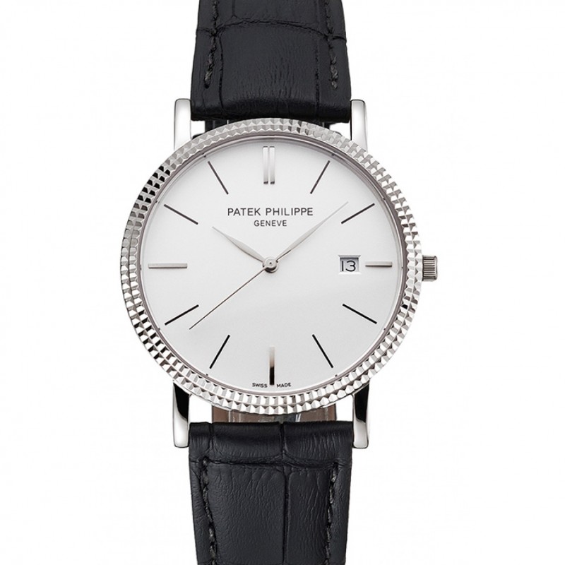 Patek Philippe Calatrava cadran blanc nervuré Bezel Boîtier en acier inoxydable Bracelet en cuir noir