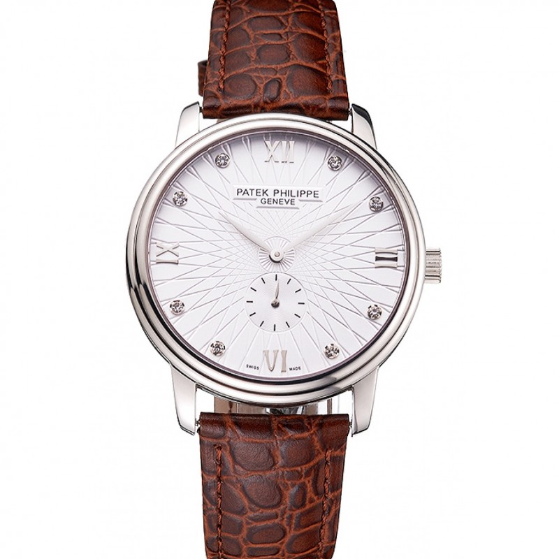Patek Philippe Calatrava blanc Date gaufrée Cadran Boîtier en acier inoxydable bracelet en cuir brun