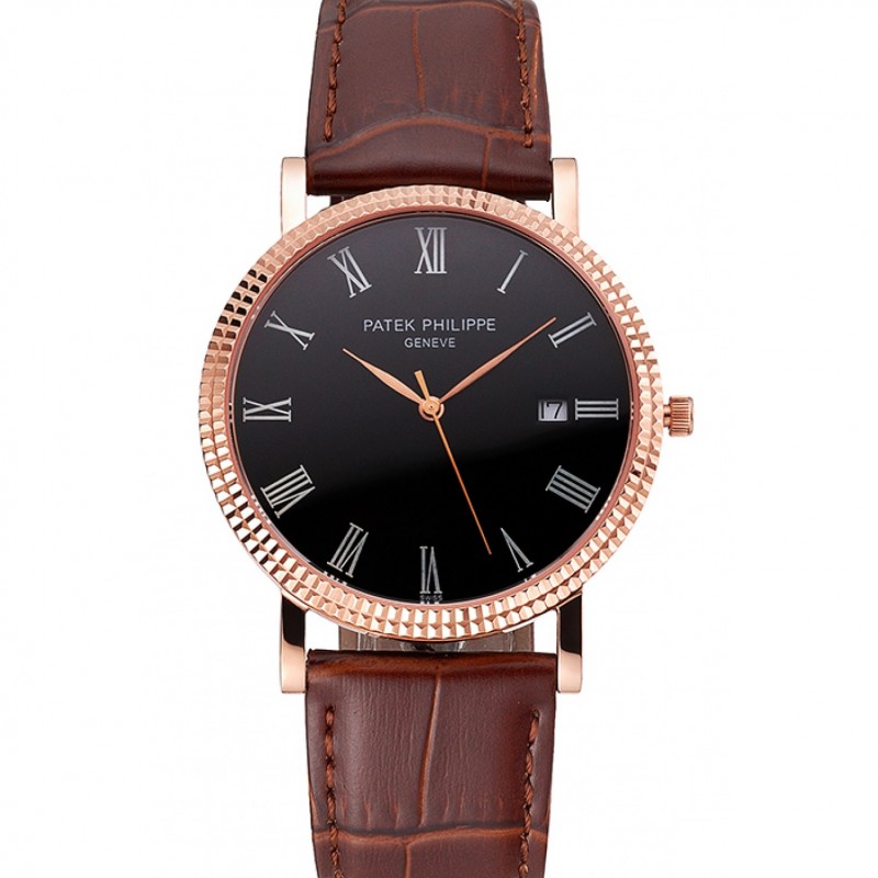 Patek Philippe Calatrava cadran noir chiffres romains nervuré Lunette or rose bracelet en cuir brun