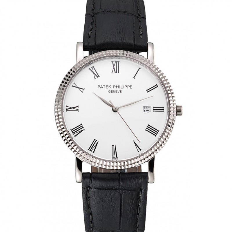 Patek Philippe Calatrava cadran blanc chiffres romains nervuré Bezel Boîtier en acier inoxydable Bracelet en cuir noir