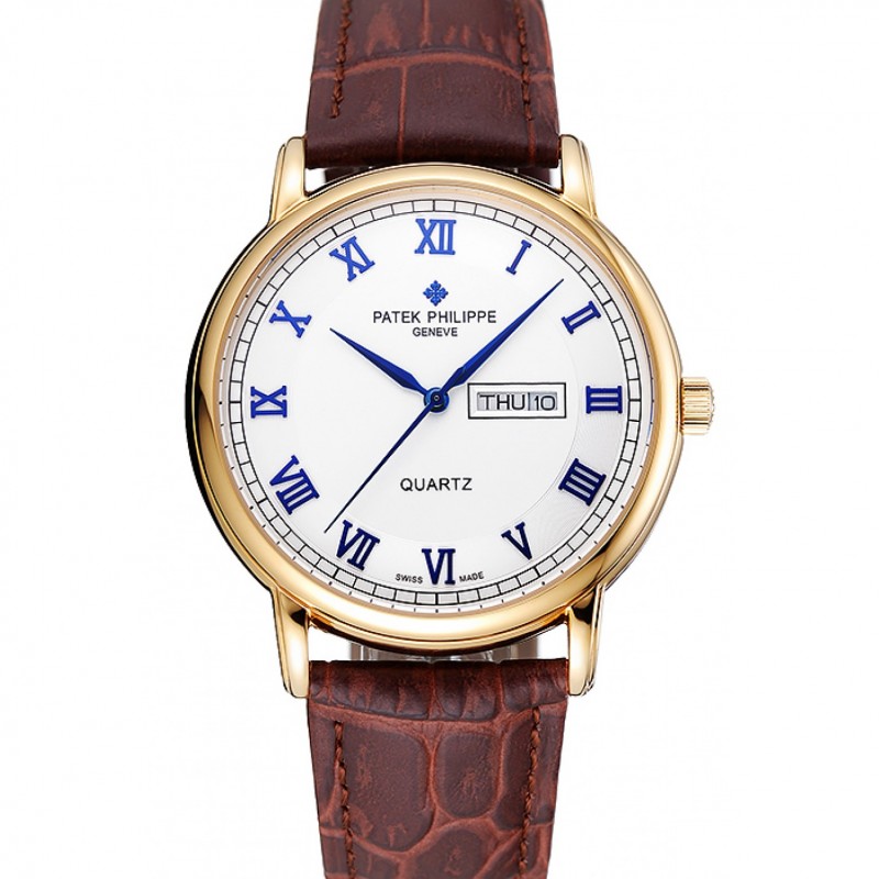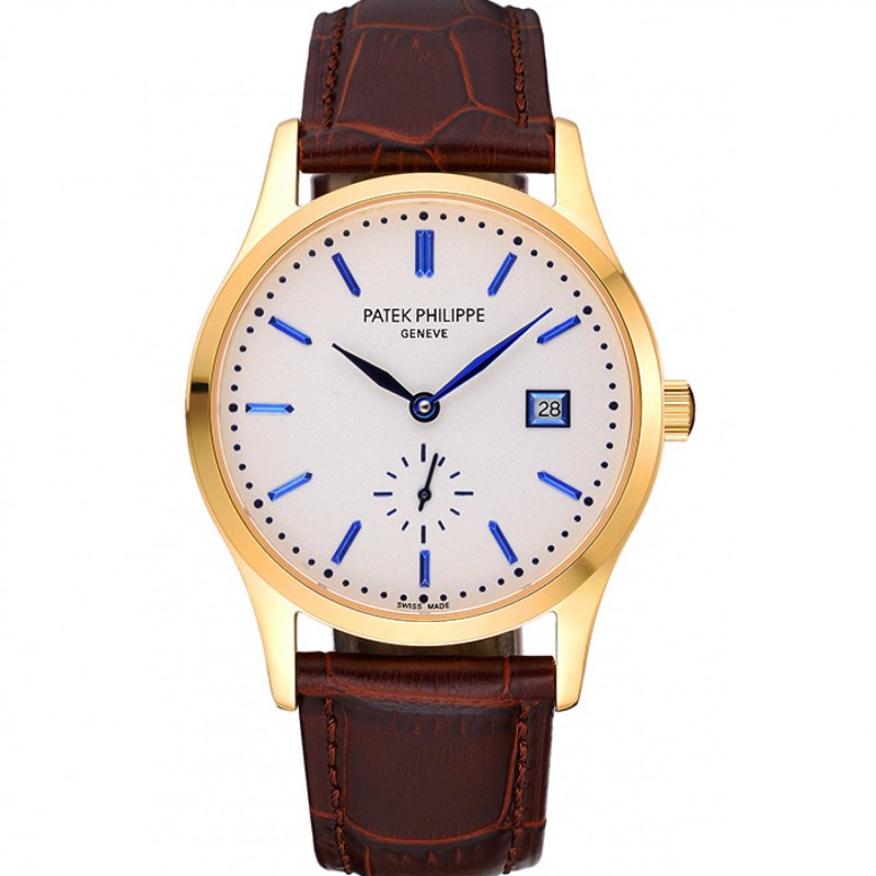 Haute qualité Patek Philippe Calatrava cadran blanc boîtier en or bracelet en cuir brun 622844