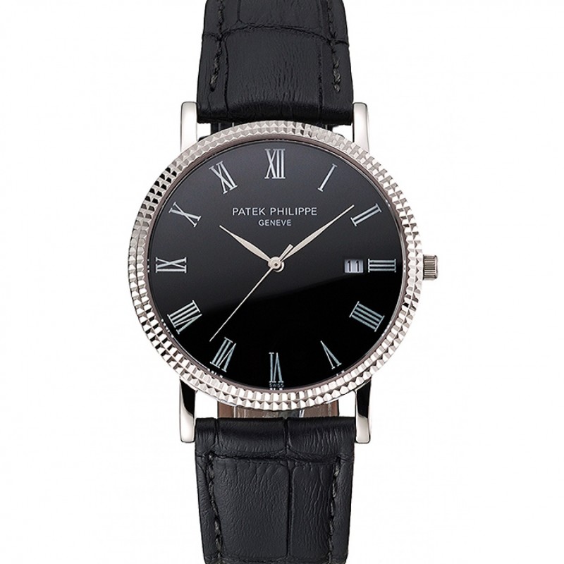 Patek Philippe Calatrava cadran noir chiffres romains nervuré Bezel Boîtier en acier inoxydable Bracelet en cuir noir