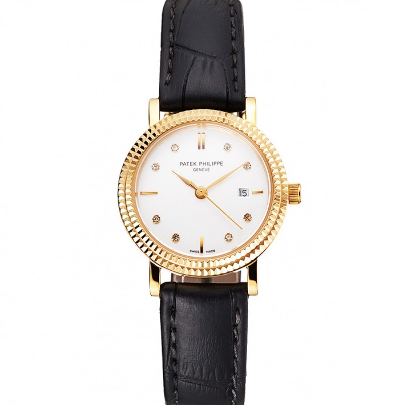 Patek Philippe Calatrava cadran blanc diamant heure marques Double nervuré Bezel boîtier en or Bracelet en cuir noir