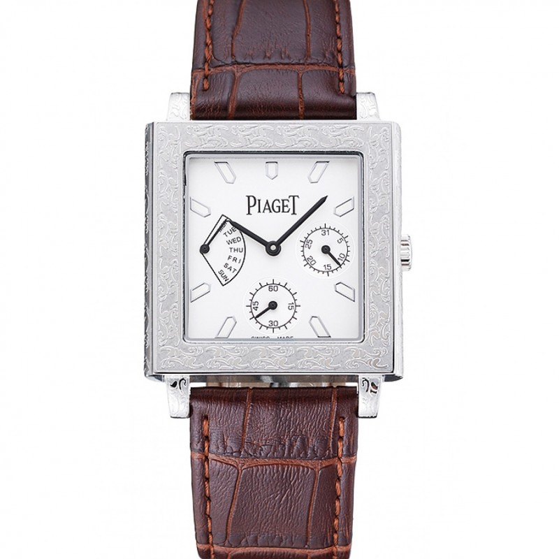 SS Replique Montre Piaget Emperador édition limitée Cadran Blanc Cas Argent Gravé Brown Bracelet en cuir 1454138