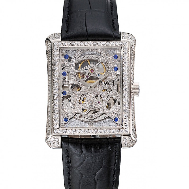 Suisse Piaget Emperador Tourbillon Squelette Argent Case Black Diamond Bracelet en cuir 1453943