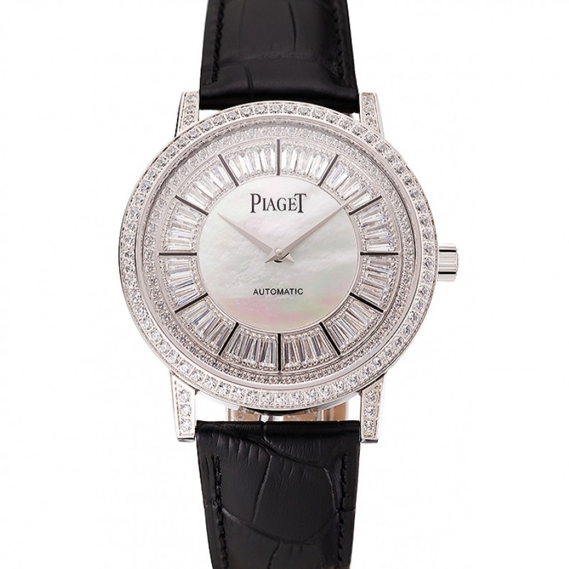Suisse Piaget Altiplano avec diamants Boîtier en acier inoxydable et cadran Pearl bracelet en cuir noir 1453746