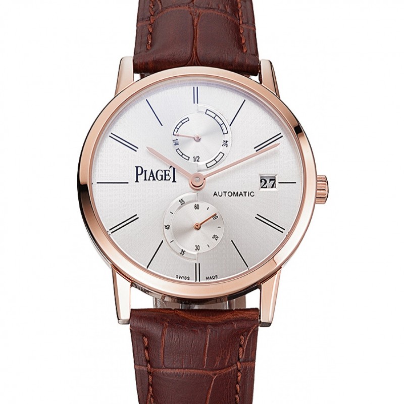 Piaget Altiplano date cadran argenté or rose bracelet en cuir brun