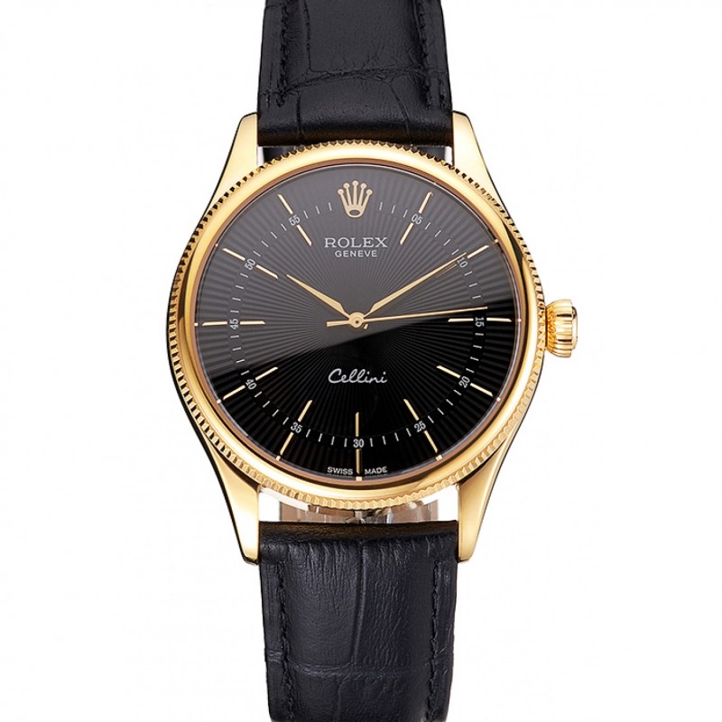 Swiss Rolex Cellini cadran noir or Marquages boîtier en or Bracelet en cuir noir