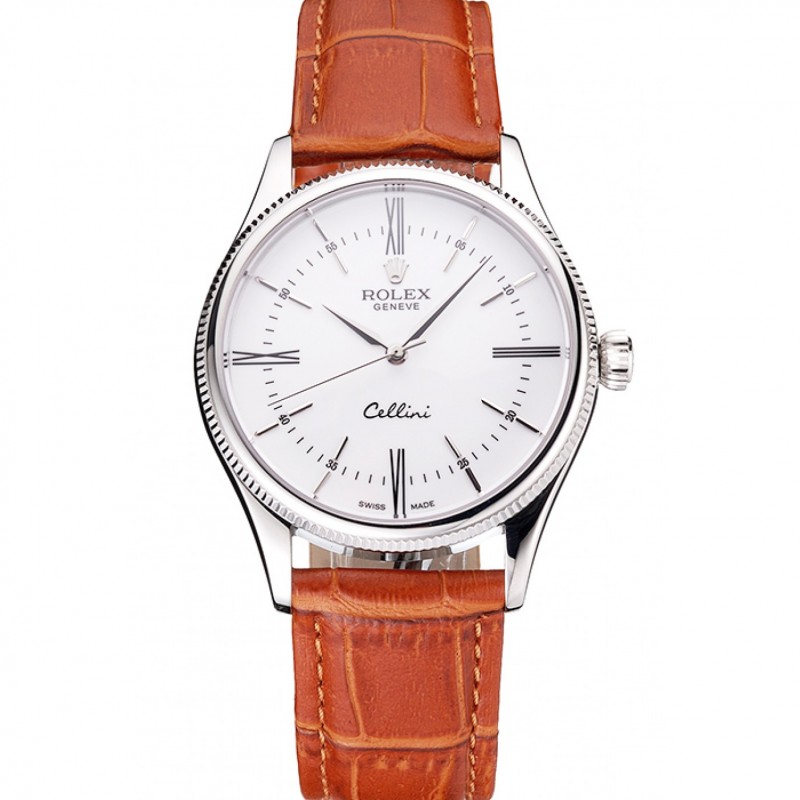 Swiss Rolex Cellini Cadran Blanc Cas en acier inoxydable Roman Numerals bracelet en cuir brun clair