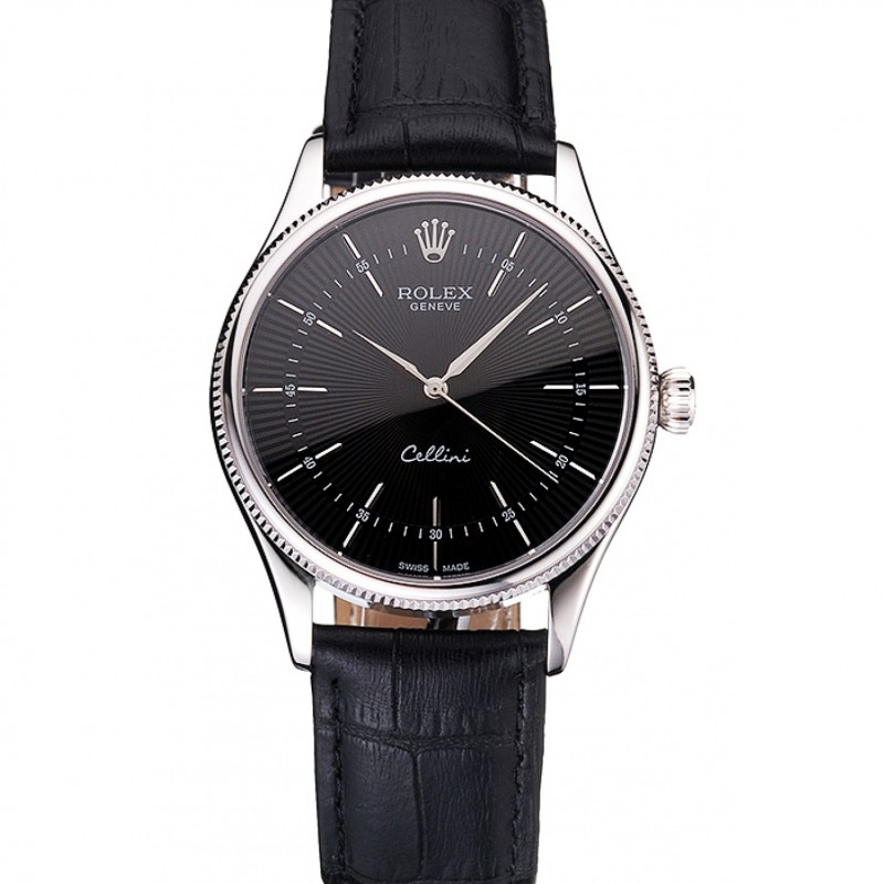 Swiss Rolex Cellini cadran noir boîtier en acier Bracelet en cuir noir
