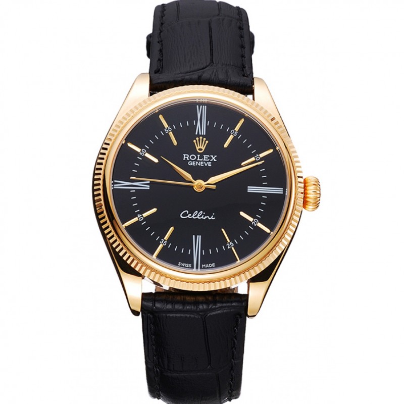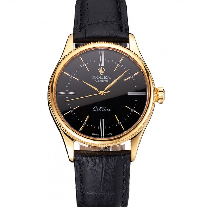 SS Replique Montre Swiss Rolex Cellini cadran noir chiffres romains boîtier en or Bracelet en cuir noir