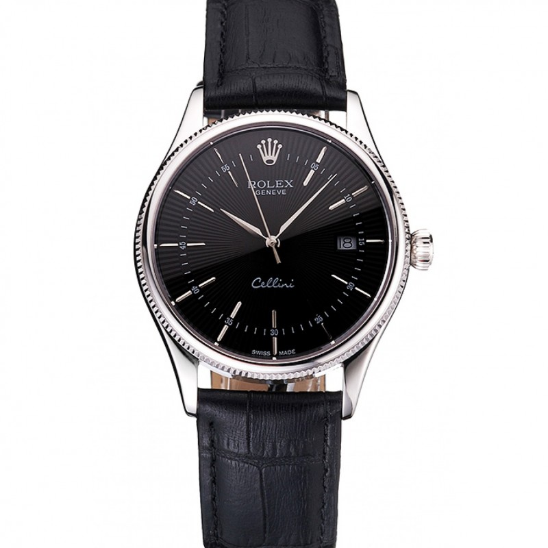 SS Rolex Cellini suisse Date de cadran noir Boîtier en acier inoxydable Bracelet en cuir noir
