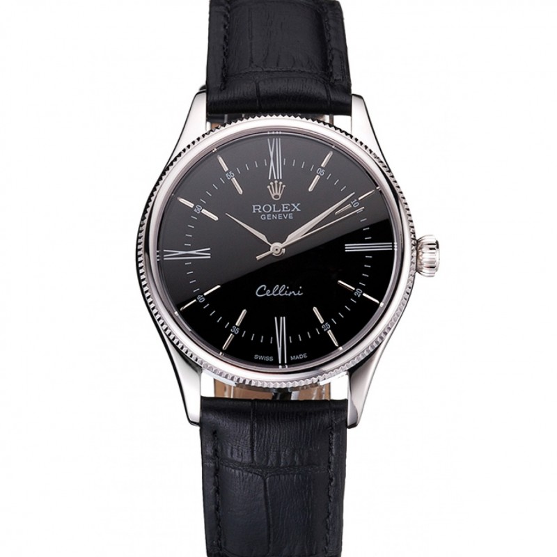 Swiss Rolex Cellini cadran noir Boîtier en acier inoxydable Roman Numerals bracelet en cuir noir