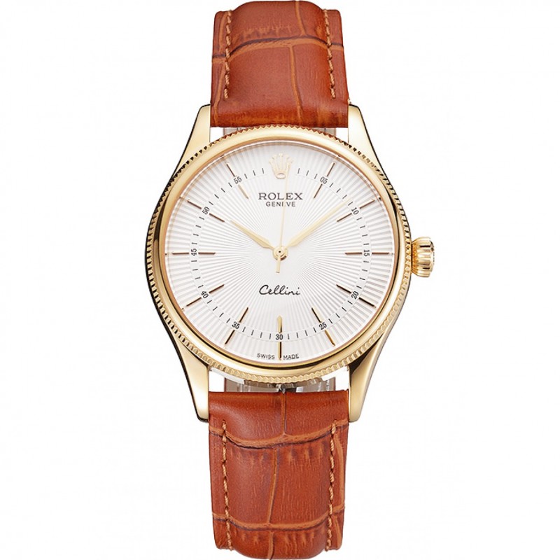 AAA Replique Montre Swiss Rolex Cellini Blanc cadran guilloché boîtier en or bracelet en cuir brun clair