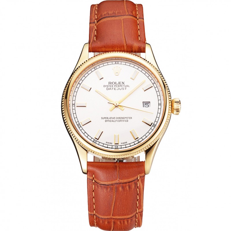 Luxe Replique Montre Suisse Rolex Datejust cadran blanc boîtier en or bracelet en cuir brun clair