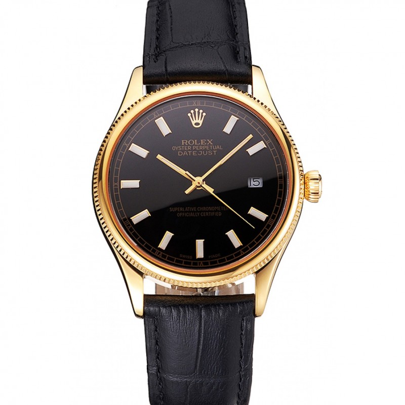 Haute qualité Replique Montre Swiss Rolex Datejust cadran noir boîtier en or Bracelet en cuir noir