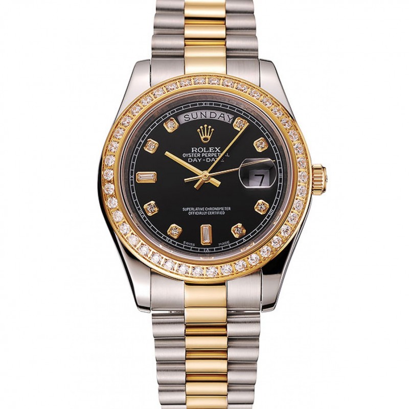 SS Day-Date Rolex suisse cadran noir diamant d’or Cas de deux tons Bracelet en acier inoxydable 1453976