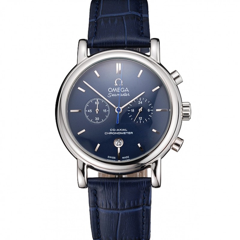 Meilleur Omega Seamaster Vintage Chronographe Cadran Bleu Boîtier en acier inoxydable Bracelet en cuir bleu